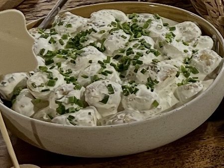 Homemade Potato Salad – tender new potatoes with fresh chives, finished in a creamy, well-seasoned dressing.