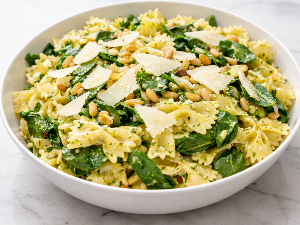 Delicate farfalle pasta tossed in a rich pesto dressing, finished with, fresh spinach and Parmesan for a fresh, vibrant dish packed with flavour.