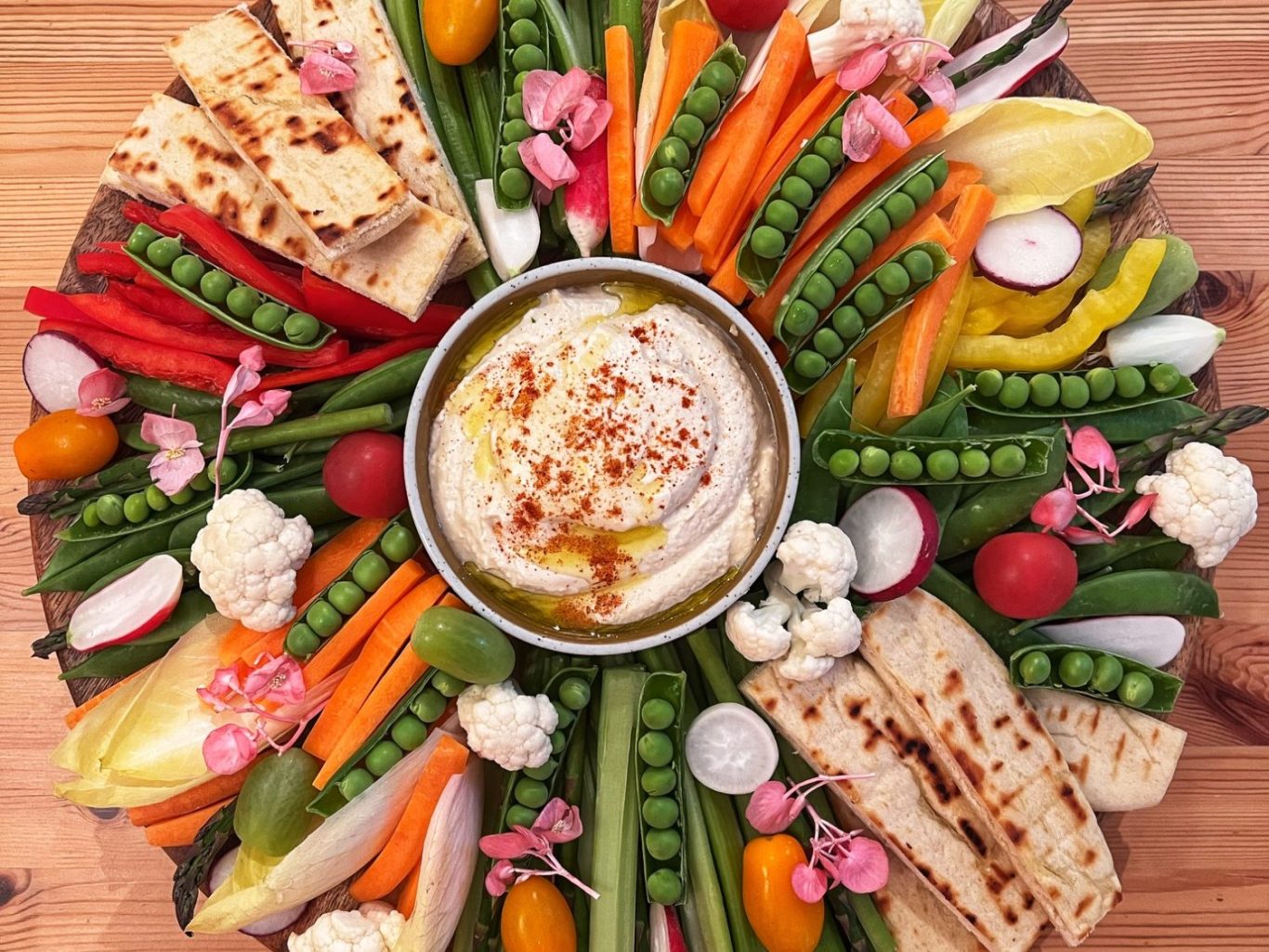 A colourful selection of fresh, crunchy vegetables with houmous and flatbread for dipping.