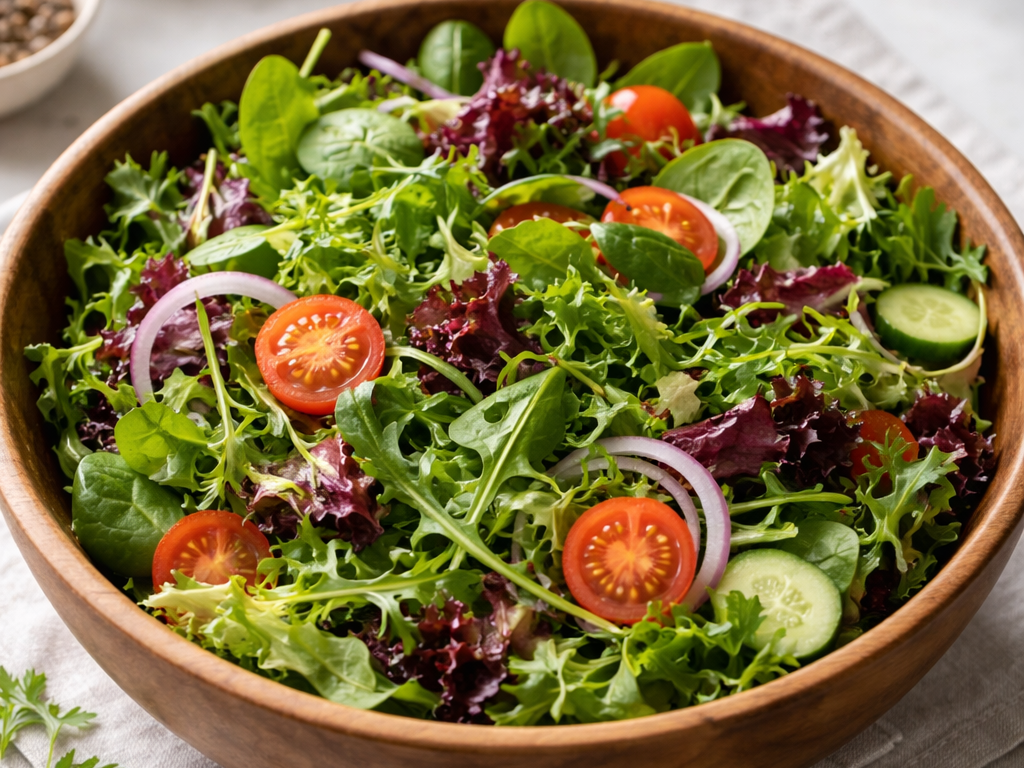 Homemade Mixed Leaf Salad – a fresh selection of seasonal leaves with cucumber, cherry tomatoes, red onion and a light dressing.
