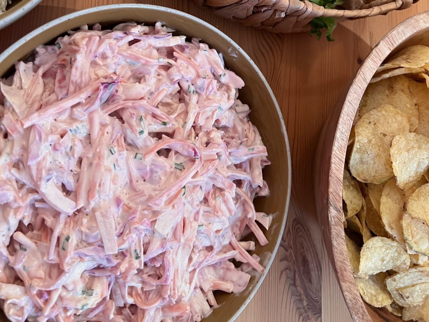 Homemade Coleslaw, crisp cabbage, carrot and onion in a rich, creamy dressing.